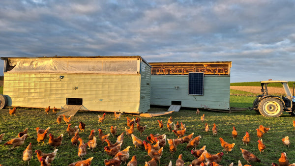 They have a free run 24/7 and are permanently on fresh pasture with the cages moved every 2 days.
